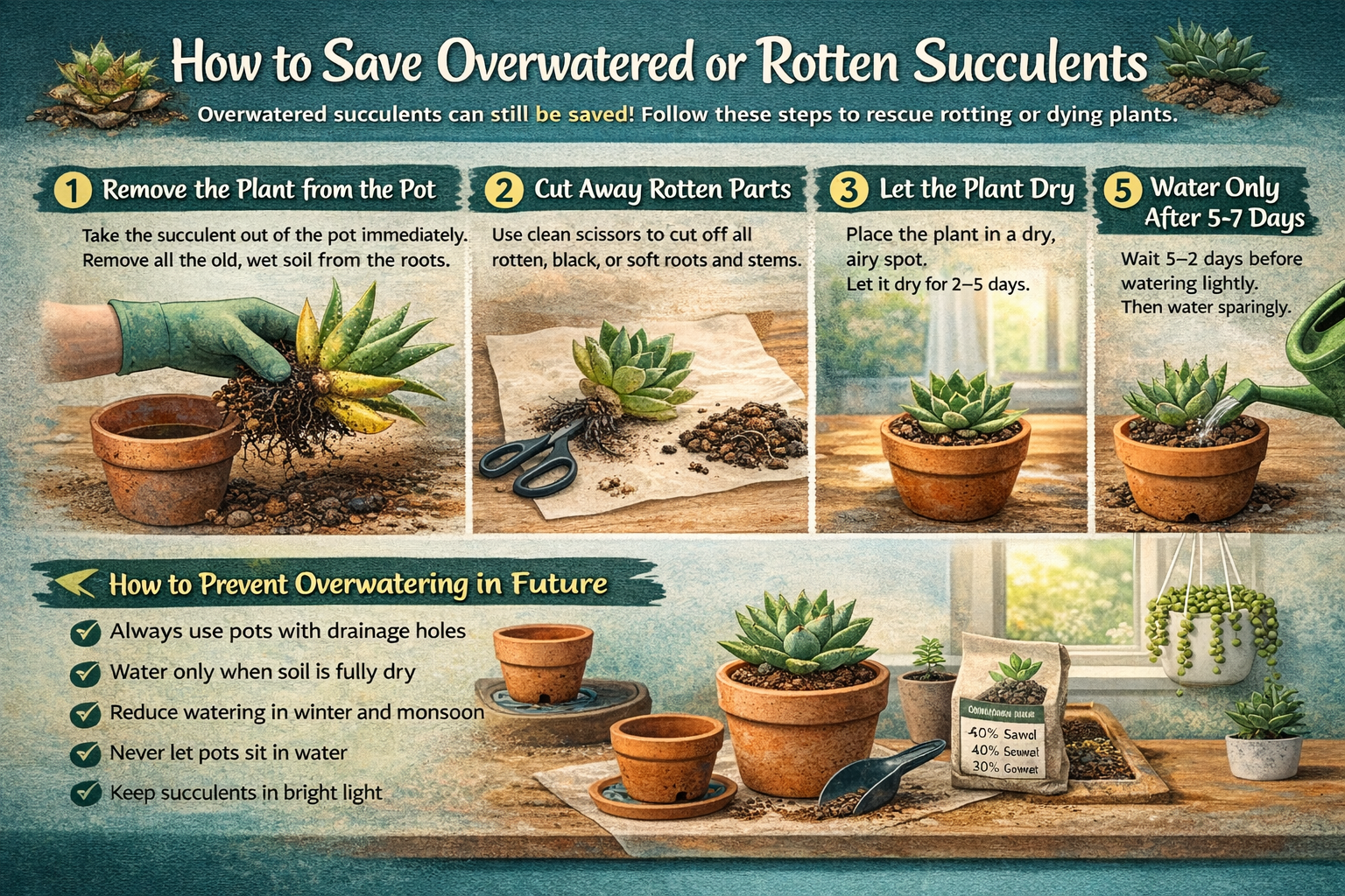 An overwatered succulent is not a dead succulent. With quick action, dry soil, and patience, most rotting plants can be saved. Succulents love dry conditions, fresh air, and sunlight — not wet soil. With proper care, your rescued succulent will grow healthy and strong again