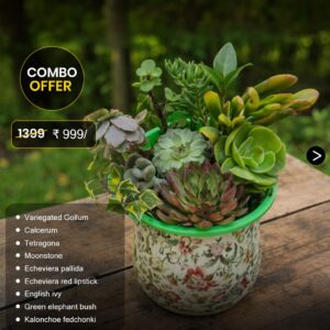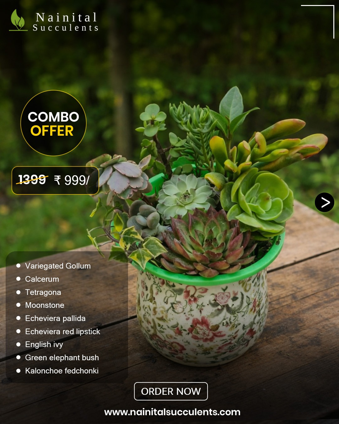 Add a refreshing touch of greenery to your space with this beautiful Succulent Combo Planter from Nainital Succulents. This decorative arrangement features a variety of colorful and unique succulents planted together in an elegant pot, creating a stunning mini garden for your home or office.